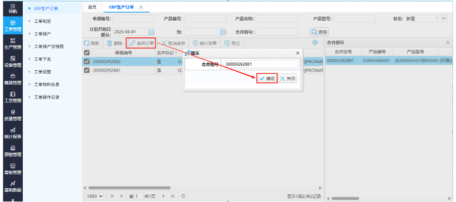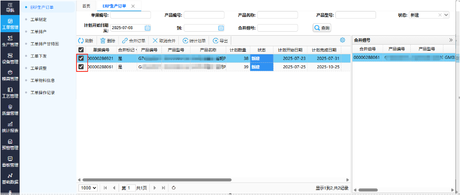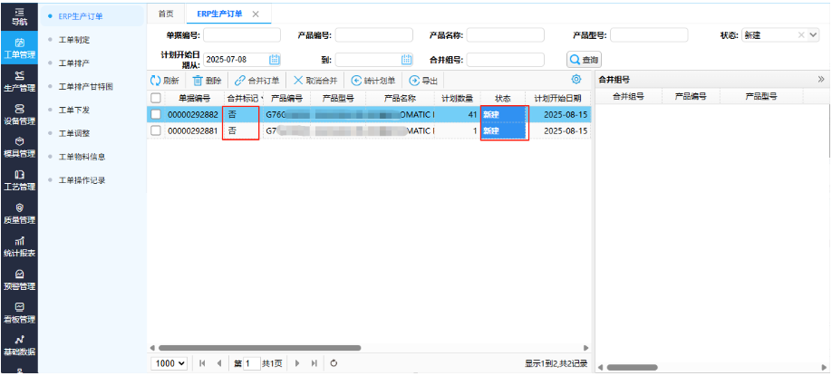 - 订单状态的合并权限:仅 “新建” 状态的订单可参与合并操作,处于已排产、生产、完成等非新建状态的订单,不支持合并操作。如需合并,需要先通过删除排产单等操作,使订单变更为“新建”状态。