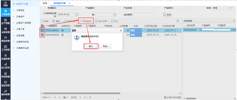 - 只有“新建”、“已排产”和“待排产”状态的订单可以取消合并。