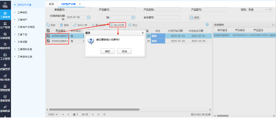 2.勾选一个或多个需要排产的订单后,单击“转计划单”,后,系统自动将订单转为计划单。