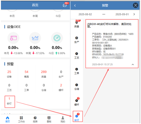- 生产概览看板和安灯呼叫看板上会显示呼叫信息,并发出鸣笛声提醒。